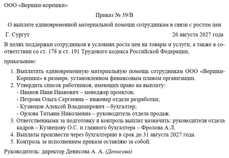 Кроме того, приказ назначает ответственных за подготовку, оформление и контроль выплат. Он определяет форму заявлений, порядок ведения реестров и контроля исполнения. Также закрепляется право руководства вносить корректировки в случае изменения экономической ситуации. Приказ создаёт прозрачную и законную процедуру оказания материальной поддержки.