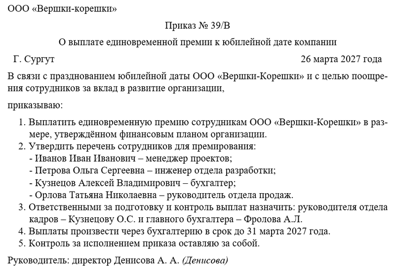 Бланк приказа о выплате единовременной премии к юбилейной дате компании