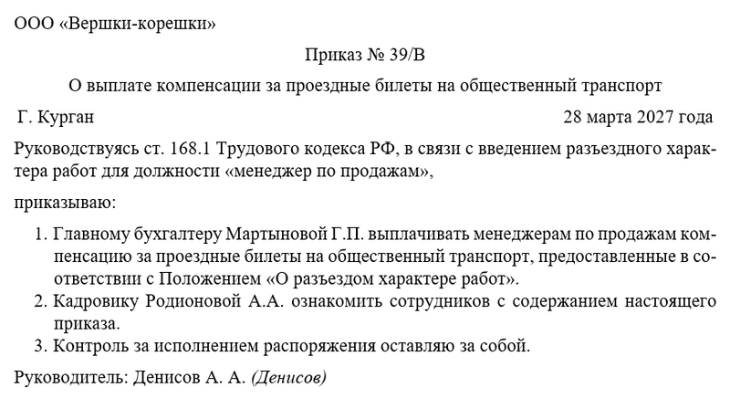 Приказ о выплате компенсации за проездные билеты на общественный транспорт — это распорядительный документ работодателя, который служит основанием для возмещения сотруднику расходов на проезд в служебных или рабочих целях.