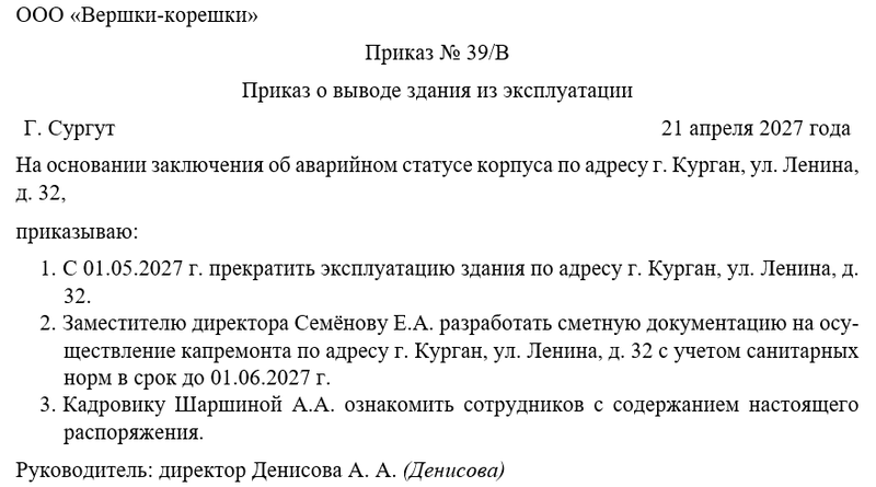 Приказ директора служит юридическим основанием для начала процедуры вывода здания из эксплуатации. В документе фиксируются причины принятого решения, сроки выполнения работ, ответственные лица и выделяемые ресурсы. Без подписанного приказа действия по демонтажу или консервации объекта считаются нелегитимными, что может привести к штрафам или судебным спорам.