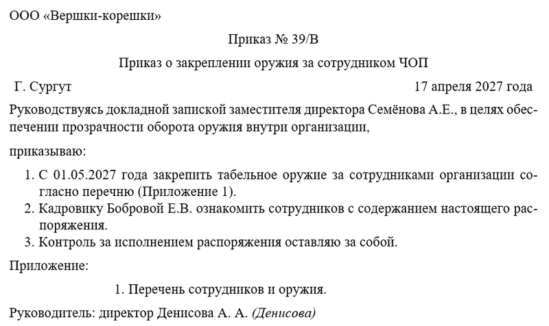 Приказ о закреплении является основным документом, подтверждающим право сотрудника на ношение конкретного экземпляра оружия. В нём указываются: модель и номер оружия, срок закрепления, условия хранения и порядок отчётности. Документ подписывается руководителем ЧОП после проверки у сотрудника всех необходимых разрешительных документов. Копия приказа хранится в личном деле охранника и в оружейной комнате предприятия. Любые изменения (перезакрепление, изъятие) оформляются отдельным приказом.