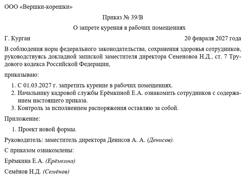 Говоря о форме приказа о запрете курения в рабочих помещениях, следует отметить, что в данный момент не существует каких-то общеобязательных унифицированных бланков, которыми сотрудники вынуждены были бы пользоваться при оформлении официальной бумаги такого толка. Отсюда получается, что при составлении приказа директора мы должны будем ориентироваться на одни лишь общие правила делового документооборота.