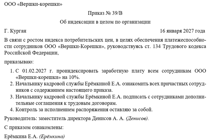 Приказ об индексации в целом по организации – это распорядительный документ, в соответствии с которым руководитель организации имеет возможность принять решение об индексации заработной платы всех сотрудников без исключения. В рамках настоящего материала мы рассмотрим, что принято понимать под индексацией, как часто она должна проводиться, как правильно оформить соответствующий приказ директора.