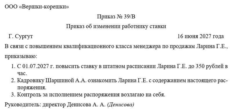 Приказ директора является ключевым документом, который легализует изменения в ставке работника и определяет новые условия труда. Он должен содержать все необходимые сведения, включая дату вступления изменений в силу, а также обоснование для их применения. Такой приказ является внутренним документом компании и служит основой для дальнейшего учета и расчета заработной платы. Важно, чтобы приказ был оформлен в соответствии с требованиями законодательства и внутренними регламентами компании, что обеспечит его юридическую силу.