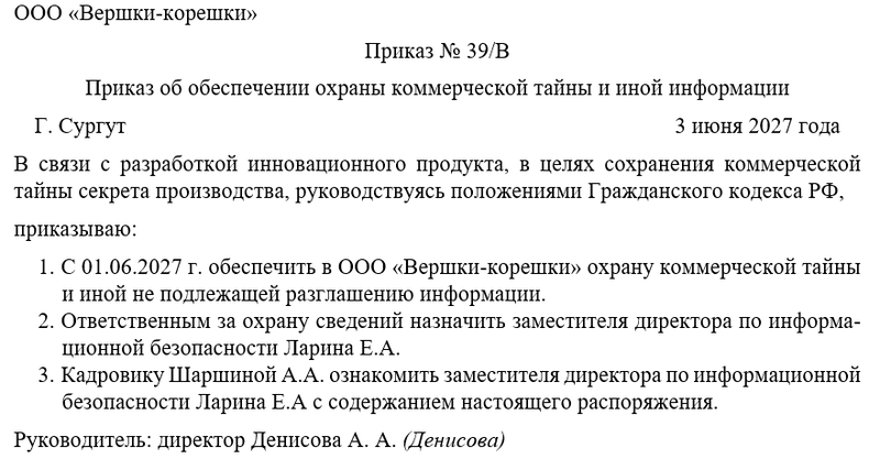 Следующим шагом директор объявляет об обеспечении охраны коммерческой тайны и иной информации. Также необходимо решить вопрос о том, кто их работников будет следить за исполнением распоряжения. Не забудем назначить одного из сотрудников ответственным за ознакомлением с новым регламентом всех коллег. Это может быть руководитель отдела или целого направления, заместитель директора. Чаще всего контроль за исполнением распоряжения директор оставляет за собой.