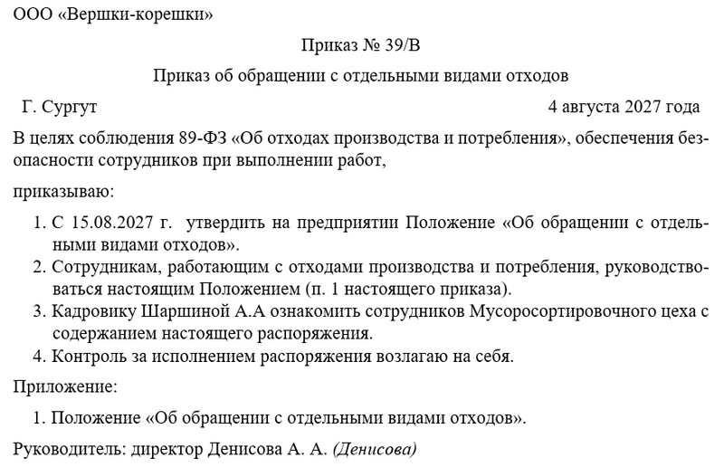 Приказ подписывается руководителем организации, регистрируется и подлежит ознакомлению под личную подпись руководителей структурных подразделений, ответственного за контроль и работников, задействованных в обращении с указанными видами отходов. К приказу прилагается утвержденный Порядок обращения. Хранится приказ постоянно.