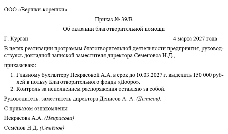 Итак, если компания всё-таки решила заняться благотворительностью, нужно будет оформить соответствующие документы правильно. Одним из них как раз и станет приказ директора.