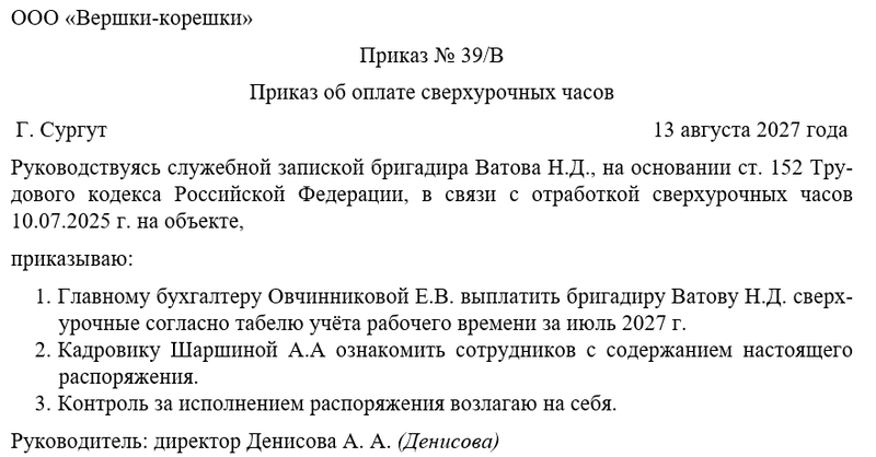 В распорядительной части перечисляются ответственные лица, порядок учёта сверхурочных и расчёта выплат, а также сроки исполнения. При необходимости указываются формы отчётности и порядок контроля. Приказ подписывается руководителем организации и доводится до сведения всех заинтересованных лиц. Он регистрируется в установленном порядке и хранится вместе с сопутствующими документами. Соблюдение правил оформления обеспечивает его юридическую силу и практическую применимость.