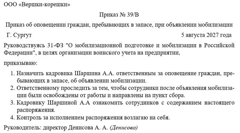 - Приступить к немедленному оповещению граждан, пребывающих в запасе, согласно полученному от военного комиссариата списку (Приложение № 1 к настоящему приказу) о необходимости их явки в [Наименование и адрес пункта сбора] в срок до [Час, число, месяц]. Ответственным за организацию и контроль оповещения назначить [ФИО полностью, должность, например, Начальника отдела кадров].