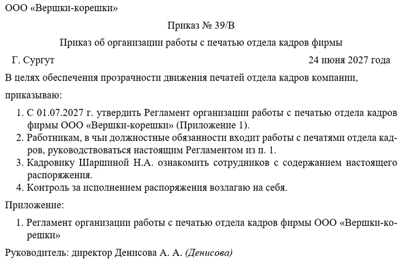 Бланк приказа об организации работы с печатью отдела кадров фирмы
