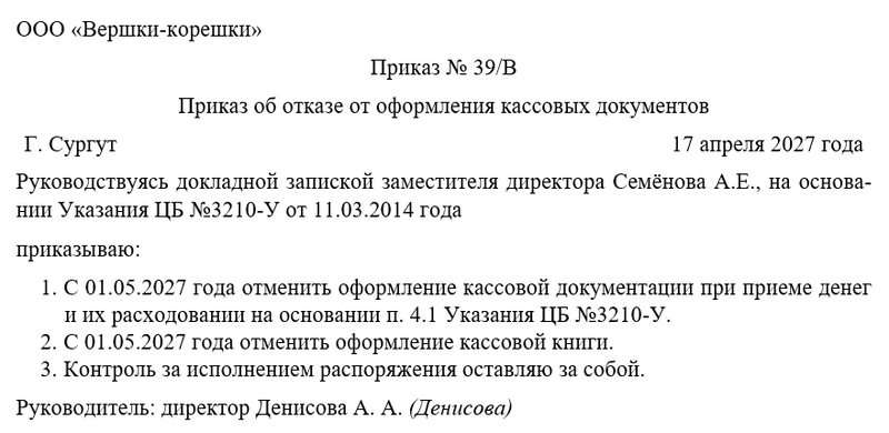 Следующим шагом руководитель объявляет об отказе от оформления кассовых документов, а также назначает человека, который будет осуществлять контроль. Чаще всего контроль за исполнением распоряжения директор оставляет за собой.