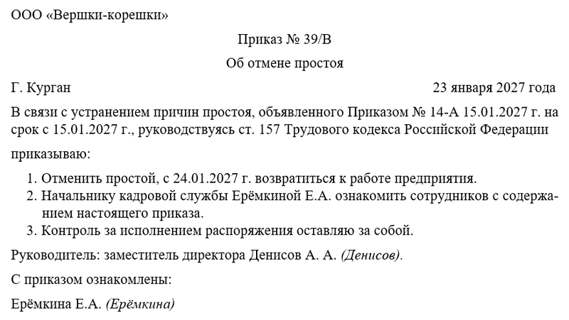 В приказе начальника могут быть указаны конкретные даты простоя, однако это необязательно. В том случае, если директор фирмы не уверен, когда сотрудники смогут возвратиться к работе, имеет смысл оставить формулировку «до устранения причин простоя». Для отмены такой паузы в работе руководителю придется издать ещё одно распоряжение.