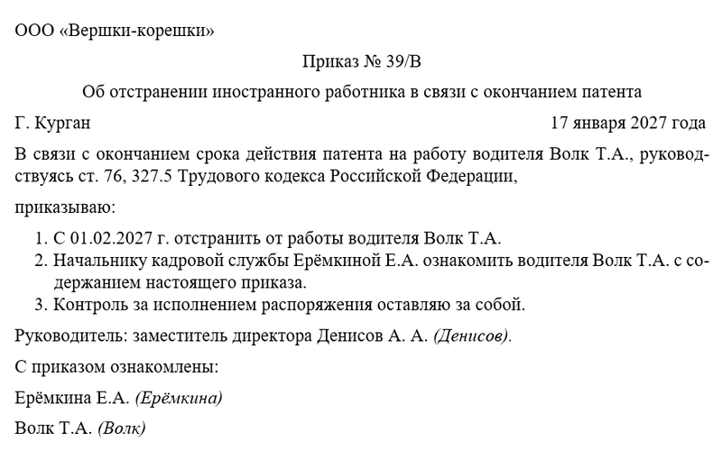 Бланк приказа об отстранении иностранного работника в связи с окончанием патента