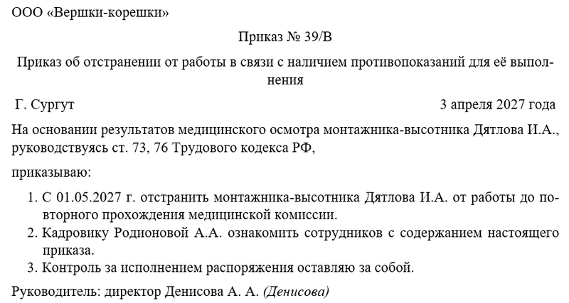 Бланк приказа об отстранении от работы в связи с наличием противопоказаний для ее выполнения