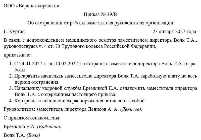 - кадровику ознакомить отстранённого заместителя с содержанием настоящего приказа;