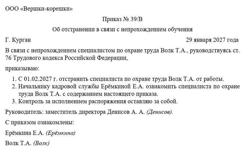 - с такого-то числа отстранить такого-то сотрудника до прохождения им обязательного обучения;