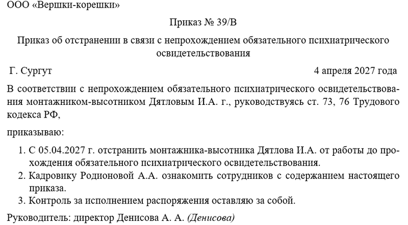 Следующим шагом руководитель об отстранении сотрудника организации в связи с непрохождением обязательного психиатрического освидетельствования, а также назначает человека, который будет осуществлять контроль. Чаще всего контроль за исполнением распоряжения директор оставляет за собой.