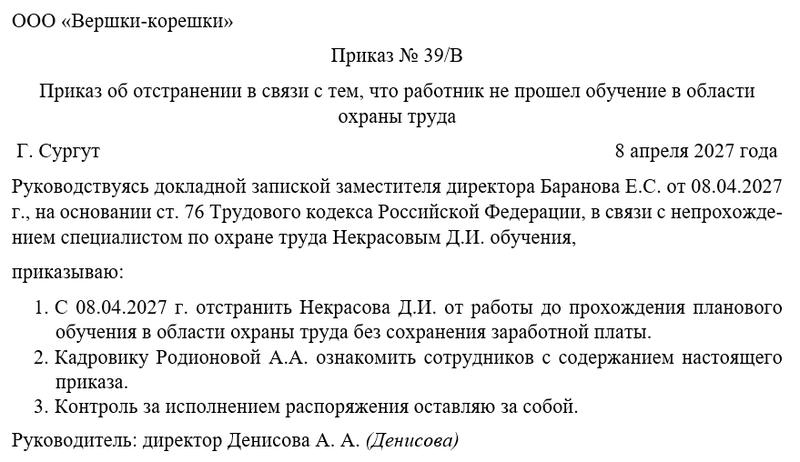 Следующим шагом руководитель объявляет об отстранении в связи с непрохождением сотрудника обучения в области охраны труда, а также назначает человека, который будет осуществлять контроль. Чаще всего контроль за исполнением распоряжения директор оставляет за собой.