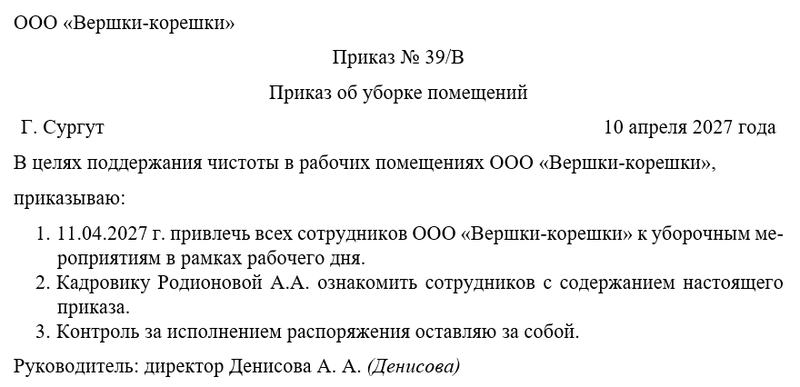 Следующим шагом руководитель объявляет об уборке помещений силами сотрудников такого-то числа, а также назначает человека, который будет осуществлять контроль. Чаще всего контроль за исполнением распоряжения директор оставляет за собой.