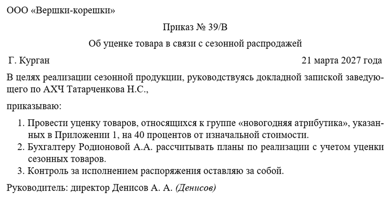 Например, приказ может содержать поручение бухгалтерии отразить уценку в учётных регистрах, а сотрудникам торгового зала — разместить актуальные ценники.