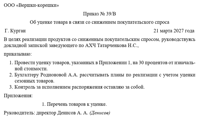 Следующим шагом руководитель объявляет об уценке товара в связи со снижением покупательского спроса, раздает подчинённым соответствующие распоряжения, возлагает ответственность за исполнение приказа, а также человека, который будет осуществлять контроль. Чаще всего контроль директор оставляет за собой.