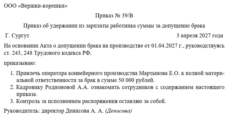 Следующим шагом руководитель объявляет об удержании из заработной платы сотрудника энной денежной суммы в связи с допущением брака на производстве, а также указывает на человека, который будет осуществлять контроль. Чаще всего контроль за исполнением распоряжения директор оставляет за собой.
