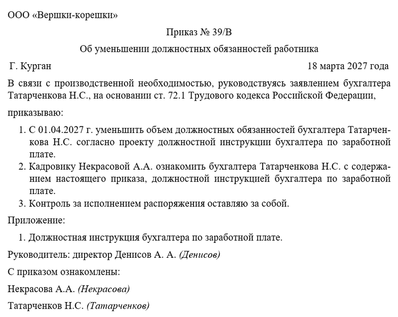 Скачать в КонсультантПлюсБесплатный доступ к документуОбразец приказа об уменьшении должностных обязанностей работника