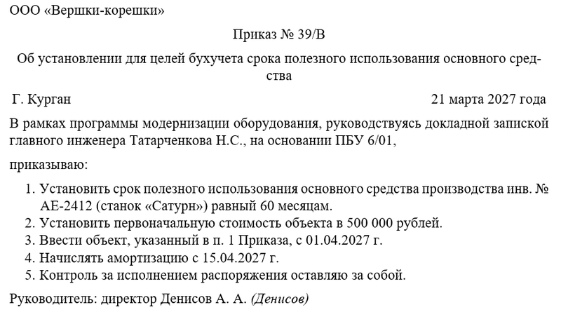 Бланк приказа об установлении для целей бухучета срока полезного использования основного средства