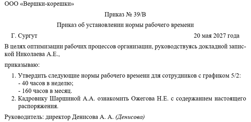 Следующим шагом руководитель объявляет об установлении нормы рабочего времени на предприятии. Также необходимо решить вопрос о том, кто их работников будет следить за исполнением распоряжения. Не забудем назначить одного из сотрудников ответственным за ознакомлением с новым регламентом всех коллег. Это может быть руководитель отдела или целого направления, заместитель директора. Чаще всего контроль за исполнением распоряжения директор оставляет за собой.