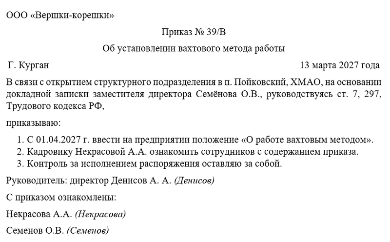 Если организация ни в одном из своих локальных актов не предусматривает возможности работы вахтовым методом, однако такой формат стал необходим в практических целях, необходимо издать соответствующий приказ директора. Его фактическим исполнителем станет кадровик.