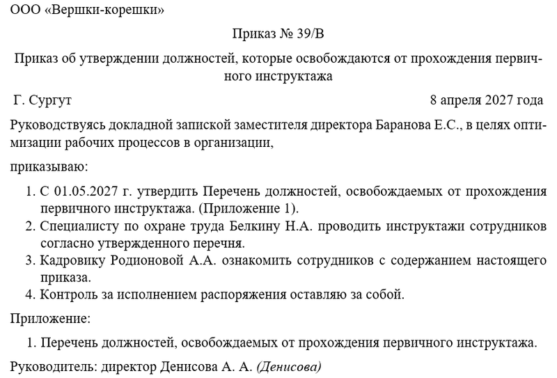 Следующим шагом руководитель объявляет об утверждении должностей, которые освобождаются от прохождения первичного инструктажа, а также назначает человека, который будет осуществлять контроль. Чаще всего контроль за исполнением распоряжения директор оставляет за собой.