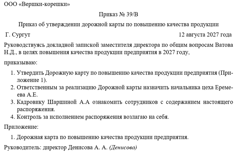 Бланк приказа об утверждении дорожной карты по повышению качества продукции