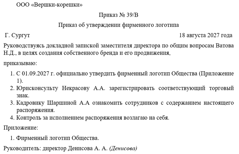 Приказ должен содержать описание логотипа и возможные варианты его использования в чёрно-белом и цветном исполнении. Также в документе указываются правила применения символа в официальных и рекламных материалах. Отдельное внимание уделяется назначению ответственного подразделения, которое будет следить за корректностью использования утверждённого знака. Таким образом, утверждение логотипа становится формализованным процессом, исключающим произвольное толкование и обеспечивающим единый стандарт.
