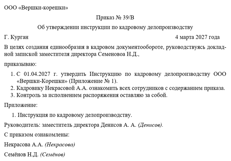 - с такого-то числа утвердить на предприятии инструкцию по кадровому делопроизводству (Приложение № 1).