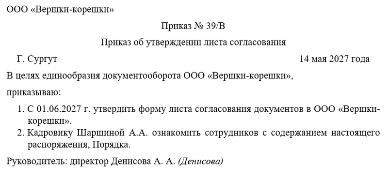 Следующим шагом руководитель объявляет об утверждении конкретного бланка для листа согласования, который будет участвовать в документообороте. При необходимости делаем ссылку на решение участников общества или совета директоров. Также необходимо решить вопрос о том, кто их работников будет следить за исполнением распоряжения. Чаще всего контроль за исполнением распоряжения директор оставляет за собой.
