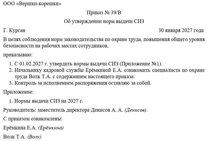 В завершение работы с документом нужно будет расписаться за всё вышеизложенное, передать итоговый вариант приказа на исполнение. С этого момента мероприятие можно назвать официально завершенным. Начиная с даты, указанной в приказе, сотрудники начнут получать СИЗ согласно утвержденным нормам.