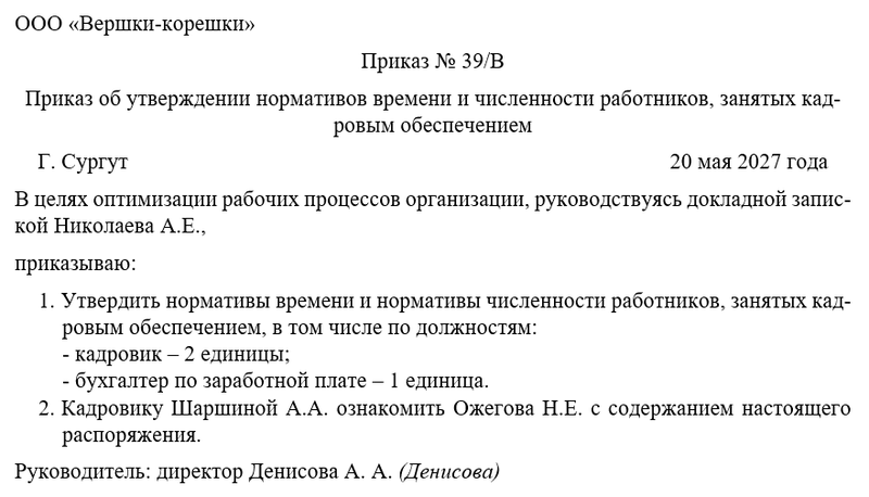 Следующим шагом руководитель объявляет об утверждении с такого-то числа нормативов времени и численности работников в организации. Также необходимо решить вопрос о том, кто их работников будет следить за исполнением распоряжения. Не забудем назначить одного из сотрудников ответственным за ознакомлением с новым регламентом всех коллег. Это может быть руководитель отдела или целого направления, заместитель директора. Чаще всего контроль за исполнением распоряжения директор оставляет за собой.
