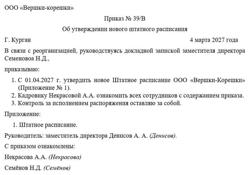 - с такого-то числа утвердить на предприятии новое штатное расписание (Приложение № 1);