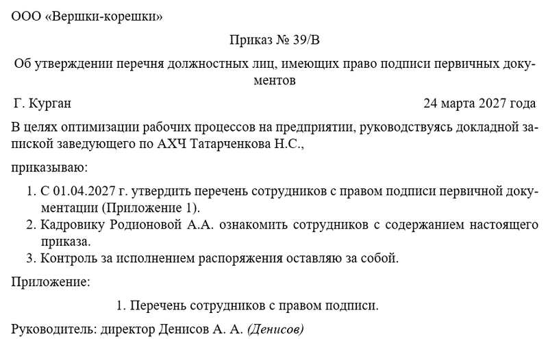 Следующим шагом руководитель объявляет об утверждении перечня должностных лиц с гарантированным правом подписи первичных документов, раздает подчинённым соответствующие распоряжения, возлагает ответственность за исполнение приказа, а также человека, который будет осуществлять контроль. Чаще всего контроль директор оставляет за собой.