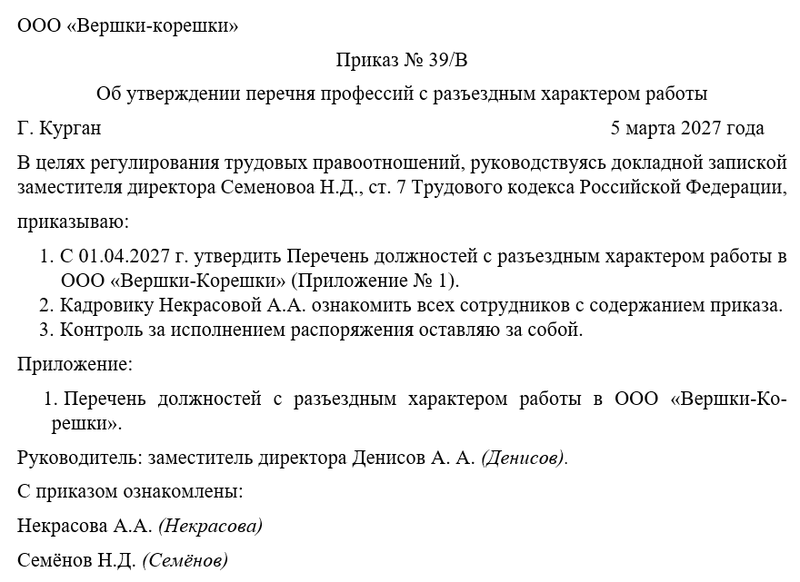 - с такого-то числа утвердить на предприятии перечень профессий с разъездным характером работы (Приложение № 1);