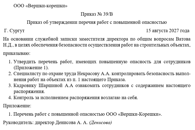 Скачать в КонсультантПлюсБесплатный доступ к документуОбразец приказа об утверждении перечня работ с повышенной опасностью