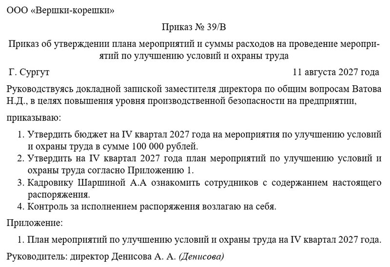 Приказ об утверждении плана мероприятий и суммы расходов на проведение мероприятий по улучшению условий и охраны труда - это документ в сфере охраны труда. Он юридически закрепляет конкретные действия и необходимые ресурсы. В рамках настоящего материала мы рассмотрим правовые основы, содержание плана, финансирование, контроль исполнения и оформление приказа. Каждый аспект важен для понимания значимости документа.