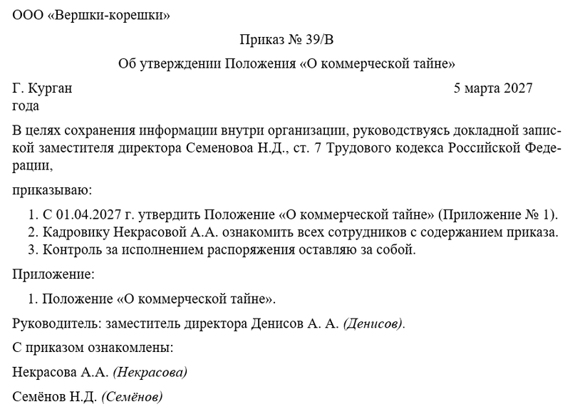- с такого-то числа утвердить на предприятии Положение «О коммерческой тайне» (Приложение № 1);