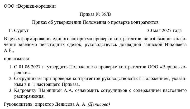 Бланк приказа об утверждении Положения о проверке контрагентов