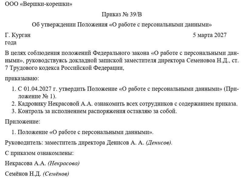 - с такого-то числа утвердить на предприятии Положение «О работе с персональными данными» (Приложение № 1);
