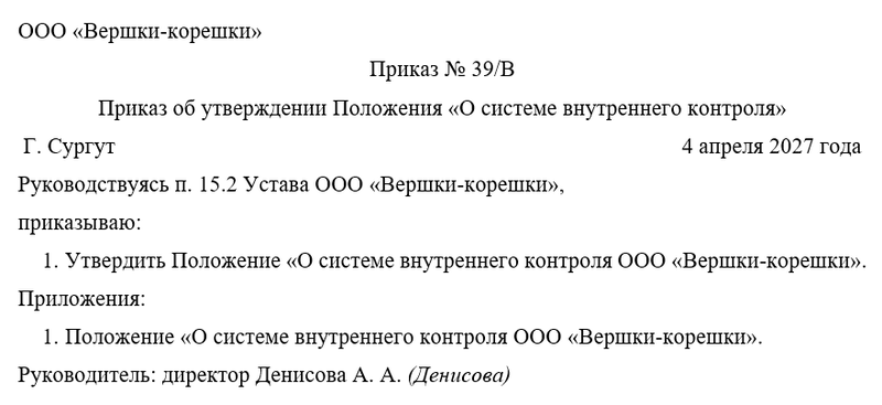 Следующим шагом руководитель объявляет об утверждении Положения «О системе внутреннего контроля», а также назначает человека, который будет осуществлять контроль. Чаще всего контроль за исполнением распоряжения директор оставляет за собой.