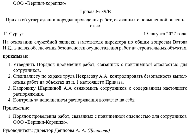 Приказ оформляется в соответствии с установленными правилами делопроизводства на фирменном бланке организации. Во вводной части указываются основания для его издания, включая ссылки на нормативные акты, внутренние положения и результаты проведённого анализа. Здесь же фиксируется цель документа — обеспечение безопасного выполнения опасных работ.