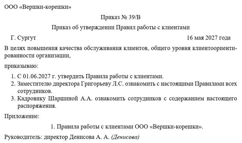 Следующим шагом руководитель объявляет об утверждении на предприятии Правил работы с клиентами. Также необходимо решить вопрос о том, кто их работников будет следить за исполнением распоряжения. Не забудем назначить одного из сотрудников ответственным за ознакомлением с новым регламентом всех коллег. Это может быть руководитель отдела или целого направления, заместитель директора. Чаще всего контроль за исполнением распоряжения директор оставляет за собой.