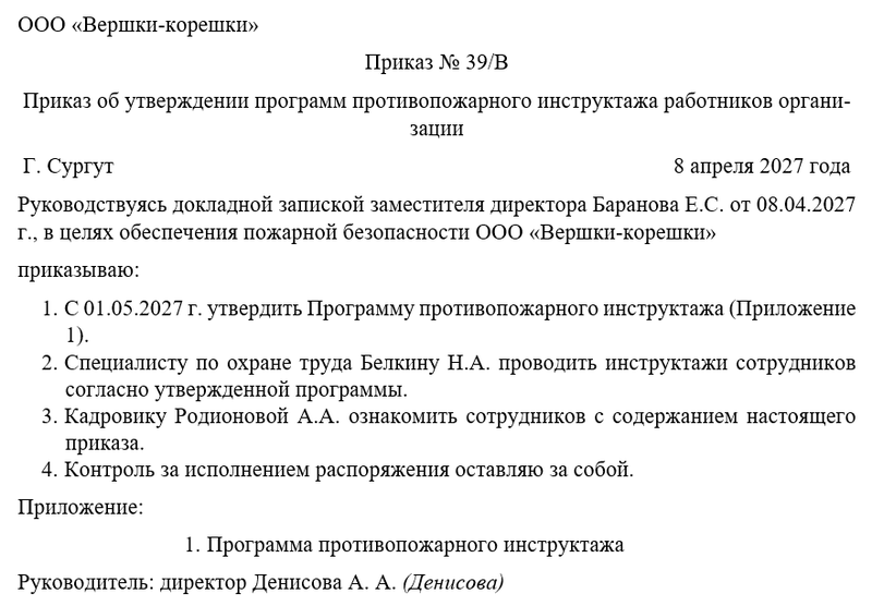 Следующим шагом руководитель объявляет об утверждении программ противопожарного инструктажа работников организации и порядка их проведения, а также назначает человека, который будет осуществлять контроль. Чаще всего контроль за исполнением распоряжения директор оставляет за собой.