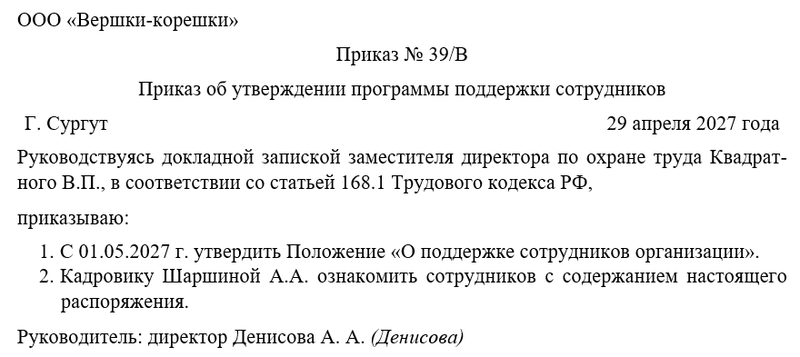 Приказ руководителя играет ключевую роль в легализации программы поддержки, так как придаёт ей официальный статус и обязательность исполнения. Документ фиксирует цели, сроки, ответственных лиц и источники финансирования, что исключает разночтения при реализации. Без издания приказа программа остаётся декларативной инициативой, не имеющей юридической силы.